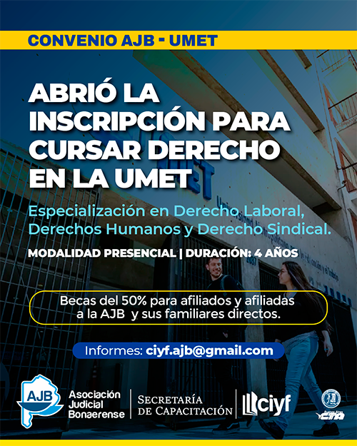 La Secretaría de Capacitación de la AJB informa que, hasta fines de marzo, se encuentra abierta la inscripción 2025 para la carrera de abogacía con especialidad en Derecho Laboral, Derechos Humanos y Derecho Sindical con modalidad presencial de la UMET y una duración de 4 años.