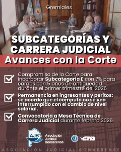 – Incorporar la Subcategoría E del Acuerdo 4093/4161 con un 7% a los cargos que cuenten con 5 años de antigüedad, durante el primer trimestre de 2026, constituyendo una respuesta importante al reclamo sostenido por la AJB en este sentido.