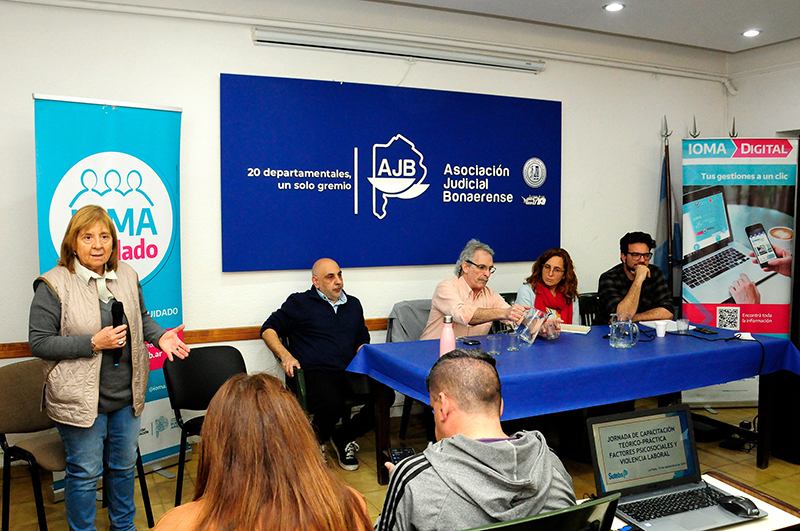 Hugo Russo, Secretario general de la AJB estuvo a cargo de la apertura, y luego expusieron Lilian Capone, coordinadora del Programa de Prevención y Promoción de la Salud de las y los Trabajadores (PPST); Nicole Guibert, directora de Promoción, Atención y Prevención de la Salud de IOMA; Adelqui del Do, vocal de IOMA por el Poder Ejecutivo; Pilar Tuculet, directora provincial de Políticas Sanitarias de Cuidado del Ministerio de Salud bonaerense; y Mabel Ojea, psicóloga e integrante de la Secretaría de Salud de SUTEBA.