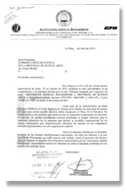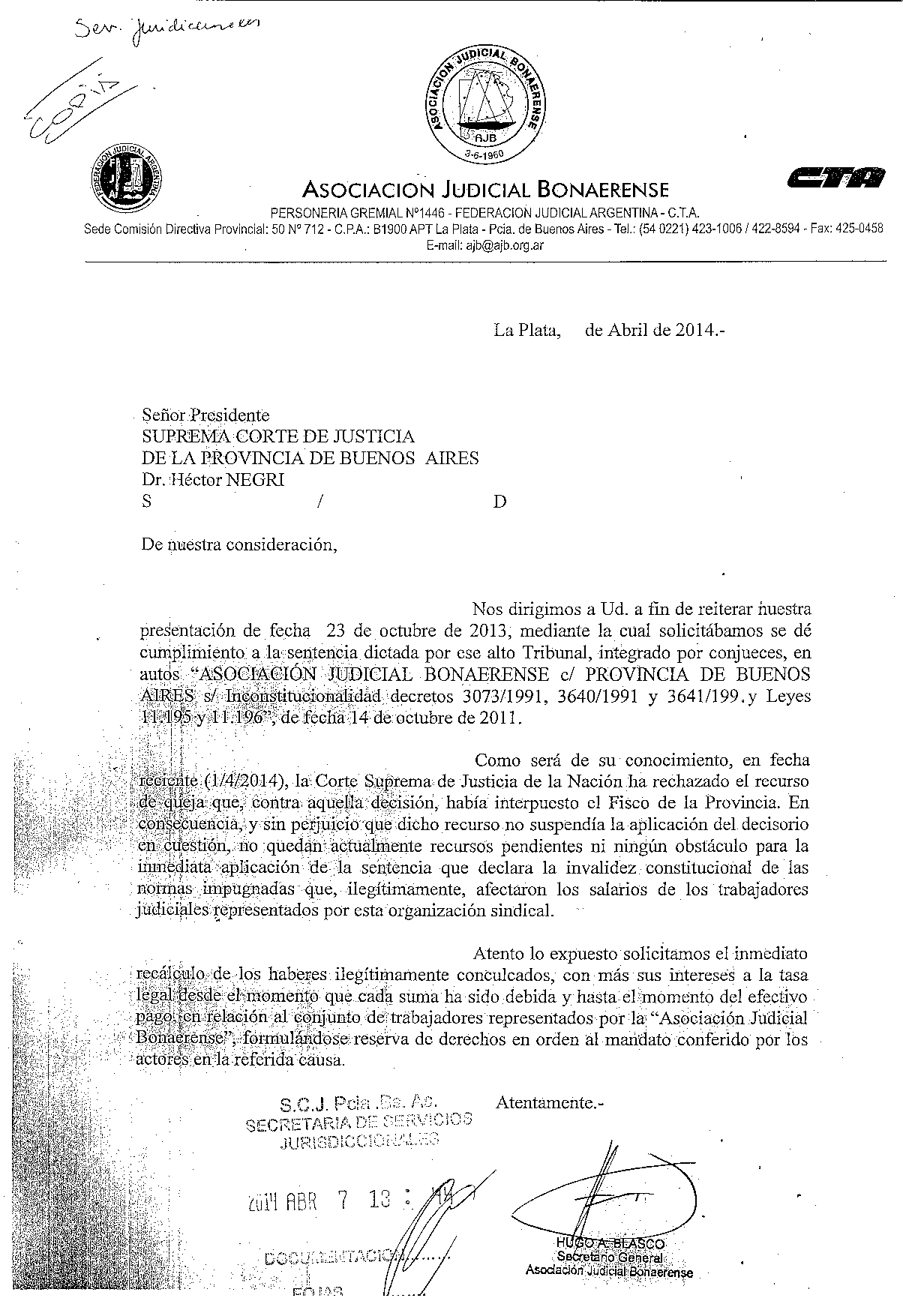 “En consecuencia, y sin perjuicio que dicho recurso no suspendía la aplicación del decisorio en cuestión, no quedan actualmente recursos pendientes ni ningún obstáculo para la inmediata aplicación de la sentencia que declara la invalidez constitucional de las normas impugnadas que, ilegítimamente, afectaron los salarios de los trabajadores judiciales representados por esta organización sindical”, señala la carta enviada por la AJB.