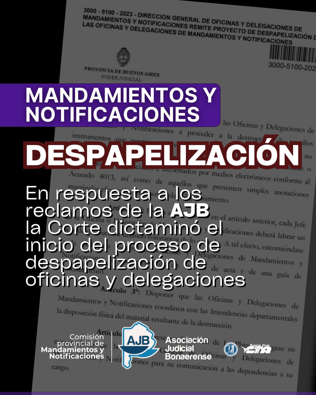 Desde la Comisión Provincial de Mandamientos y Notificaciones de la AJB informamos que, con fecha 30 de diciembre de 2025, la Suprema Corte, a través de la Secretaría de Servicios Jurisdiccionales, dictó la Resolución RSSJ N° 1939/2025, mediante la cual se autoriza el proceso de despapelización en las Oficinas y Delegaciones de Mandamientos y Notificaciones.
