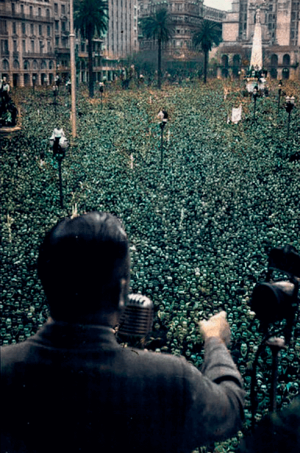 […] En todo el país la gente se reúne para hacer lo que pueda por quien es su ídolo. No solamente los hombres, también sus mujeres y sus hijos. Ese coronel Perón había escuchado sus quejas y resuelto en la medida de lo posible sus aspiraciones. Pero no era solamente eso; lo material fue lo menos importante. Los había tratado de igual a igual como seres dignos. Los mensú de Misiones, los cañeros de Tucumán, los obrajeros del Chaco, los faenadores de Berisso, los obreros de las fábricas de Avellaneda y Quilmes, los artesanos de los barrios de Buenos Aires, los ferroviarios, los tranviarios, los operarios de las usinas eléctricas, los colectiveros, los canillitas, el pueblo entero de la República se sienten heridos por la prisión del coronel […]. (5)