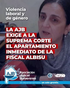 En este contexto, exigimos a la Suprema Corte de Justicia de la Provincia de Buenos Aires que intervenga de forma inmediata y disponga el apartamiento compulsivo de Albisu, mientras se sustancia el proceso de enjuiciamiento que tramita actualmente. La presencia de esta fiscal en su cargo no solo pone en riesgo la salud psíquica y física de las y los compañeros judiciales, sino que constituye un mensaje nefasto: que quienes ejercen violencia pueden seguir impunes si cuentan con protección política.