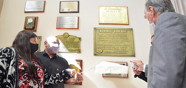 En el Hall Central de Tribunales se descubrió una placa conmemorativa como símbolo de agradecimiento a las y los judiciales de todas las departamentales que pelearon en Malvinas. La coordinación del acto estuvo a cargo del Secretario Gremial de la AJB, Oscar Yenni, y también dirigió unas palabras a los presentes, Patricia Focaccia, Secretaria de Hacienda de la Departamental La Plata.