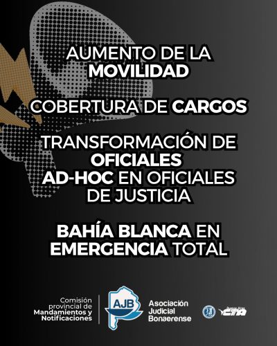 Respecto de la Oficina de Bahía Blanca, existe una situación de emergencia total, luego del temporal sufrido en marzo del 2025, al reclamo de cobertura urgente de cargos, se suma la situación de infraestructura en general del municipio que hace más difícil las diligencias, la situación social y de salud de la población en general no es buena, y la salud psicofísica de las y los compañeros en este contexto también se vio afectada.