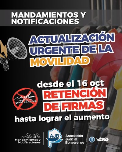 La AJB expresó, sobre este punto, que no existen posibilidades de seguir esperando la actualización largamente reclamada, por lo cual, luego de la instancia técnica analizando la crítica situación, se definieron las medidas de fuerza que se comunican, consistentes en la realización de retención de firmas a partir del 16 de octubre hasta lograr el aumento.