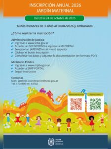 Las empleadas y empleados bajo la órbita de la Corte deberán ingresar al sitio www.scba.gov.ar, acceder a la opción USO INTERNO e ingresar a MI PORTAL, seleccionar la opción JARDINES en el menú superior y clickear el botón Inscripción, completar los datos y adjuntar la documentación (en formato PDF).