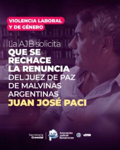 La AJB sostuvo además que el gobernador de la provincia de Buenos Aires tiene la potestad de rechazar la renuncia y reclamó que se garantice el avance del juicio político como única vía posible de reparación para las personas afectadas, en cumplimiento de los compromisos asumidos por el Estado en materia de derechos humanos y violencia de género.