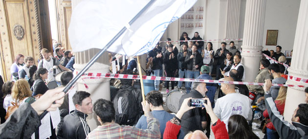 Culminando el paro total de 48 hs. decretado por la AJB en reclamo de la reapertura de la negociación paritaria, trabajadores y trabajadoras judiciales de las diecinueve departamentos judiciales se congregaron en los tribunales de la calle 13 y realizaron una recorrida por los pasillos de la Corte coreando las reivindicaciones del gremio.