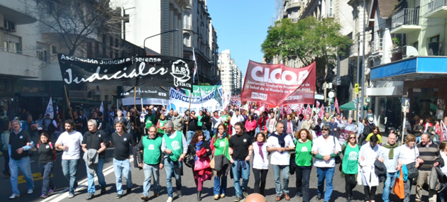 Ayer trabajadores judiciales y profesionales de la salud de la provincia de Buenos Aires realizaron un paro total de actividades y se movilizaron a la Casa de la Provincia en la ciudad de Buenos Aires para reclamar la reapertura de la discusión salarial.