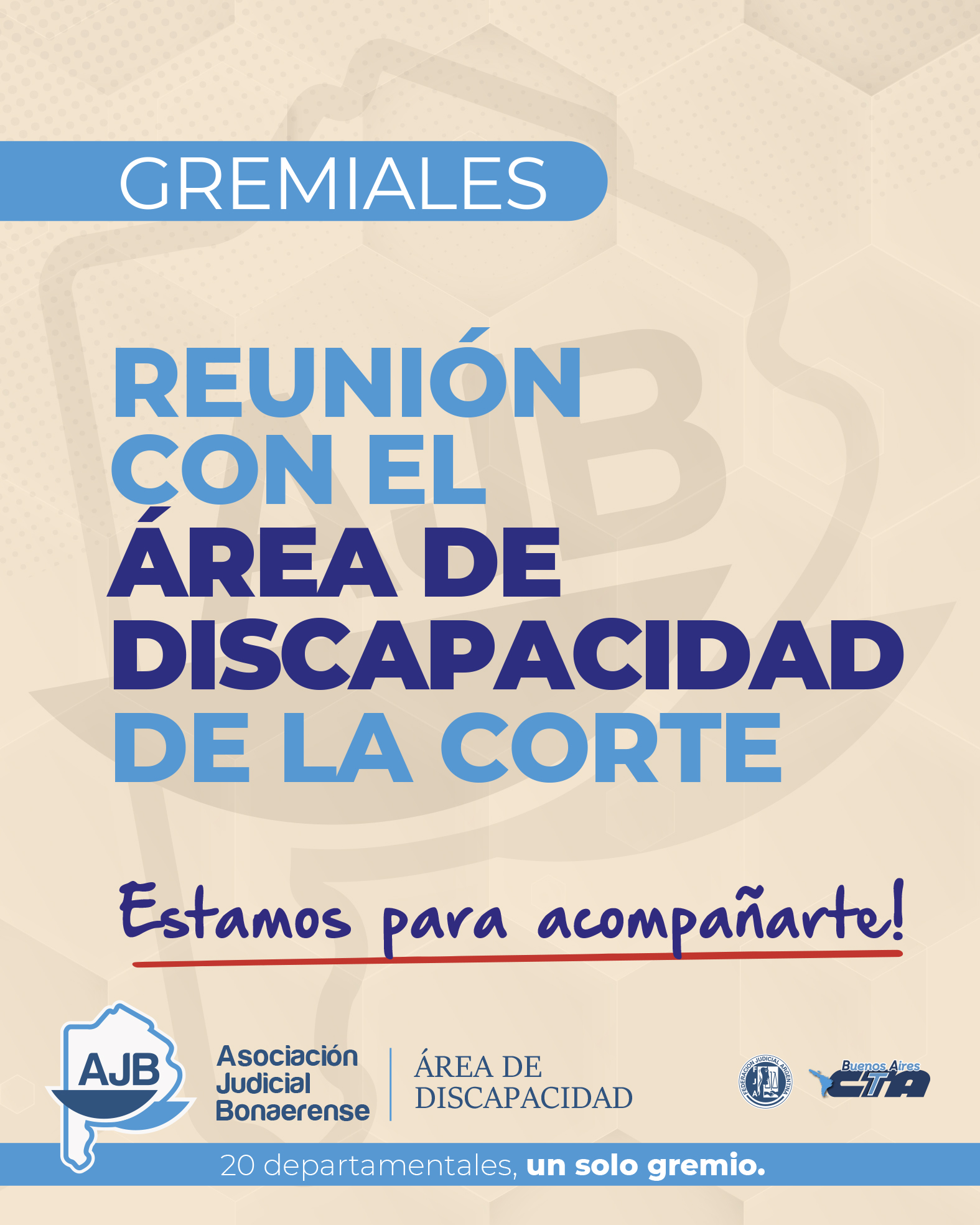 Recordamos que recientemente desde la Secretaría Gremial se decidió fortalecer el Área de Discapacidad de la AJB y estamos trabajando para darle un fuerte impulso que nos permita ampliar derechos y mejorar las condiciones laborales.