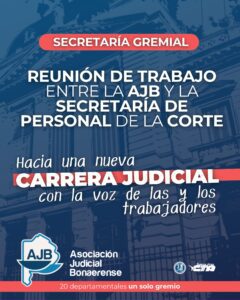 ➡️ Durante la reunión se coincidió en avanzar en la construcción de una Carrera Judicial integral, que no se limite a modificaciones sectoriales, en el marco de una perspectiva orientada hacia la construcción de un Convenio Colectivo de Trabajo. Se realizó un diagnóstico inicial y se resolvió trabajar por agrupamientos, junto con los directores de cada área —como Arquitectura, Ordenanzas, Choferes, Administrativos de Organismos Jurisdiccionales, Informática, Sanidad, Bibliotecas, Peritos, entre otros—. Desde la AJB consideramos que este abordaje permitirá plasmar los cambios estructurales necesarios frente a la incorporación de nuevas tecnologías y funciones en el funcionamiento del sistema judicial.