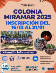 La Secretaría de Acción Social informa que el plazo para inscribirse para la Colonia Miramar 2025, que organiza el gremio para las y los hijos de los afiliados y afiliadas, se extendió hasta el 21/01. ❗Podrán inscribirse las y los niños que hayan egresado de 6º año de la Escuela Primaria durante 2024.
