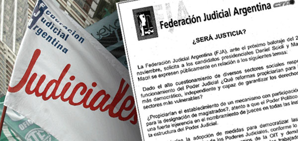 La Federación Judicial Argentina pidió a los candidatos presidenciales Daniel Scioli y Mauricio Macri que se expresen públicamente sobre varios temas que atañen a la Justicia y sus trabajadores. Leé la solicitada publicada en el Diario La Nación.